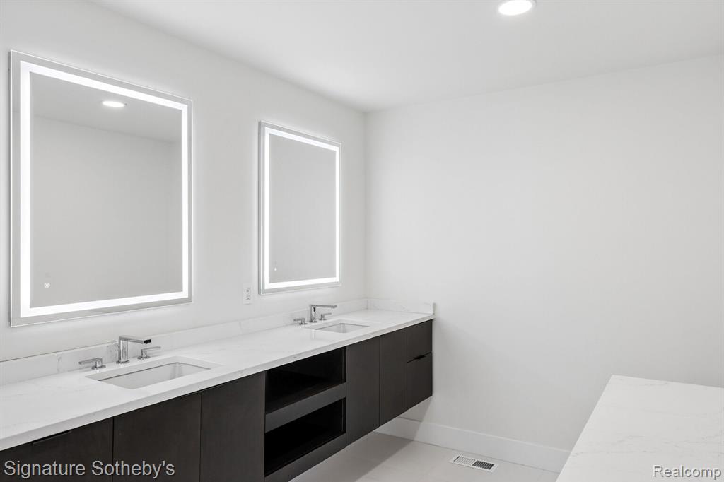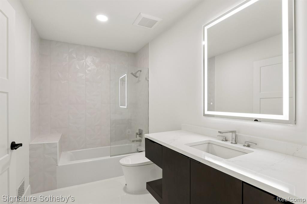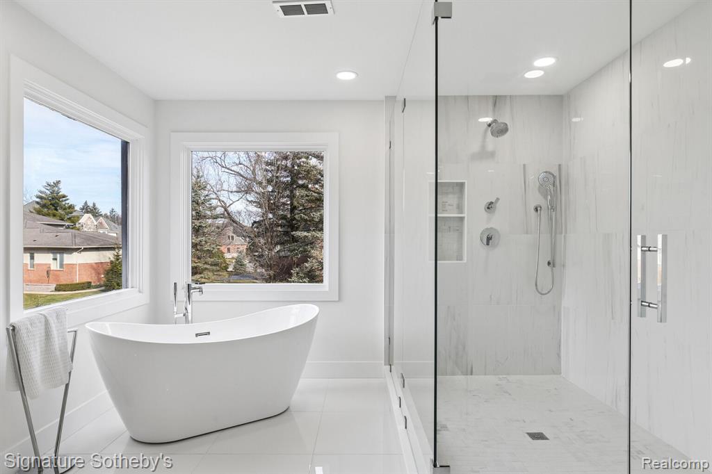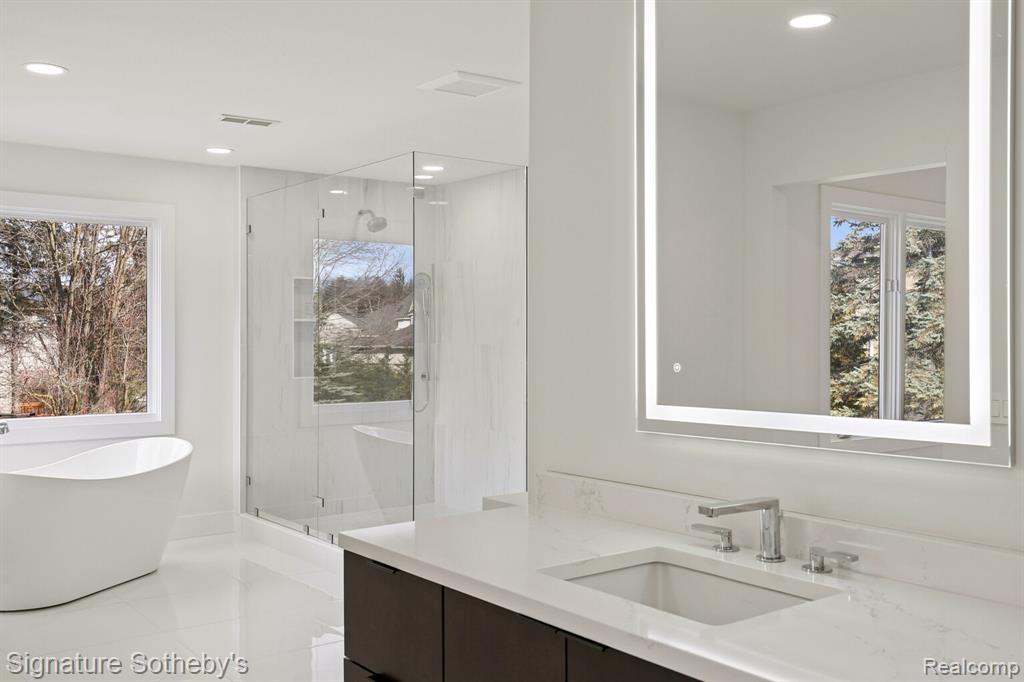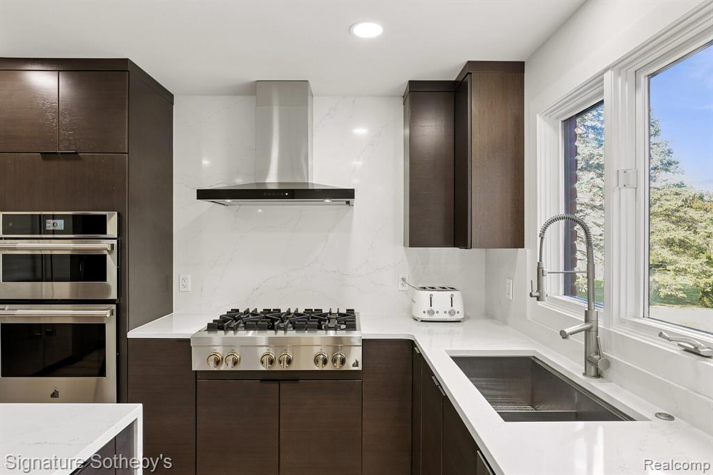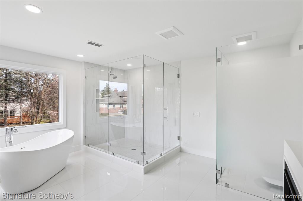 Designed for both everyday living and entertaining, the main level features a dramatic living room with soaring ceilings and a sleek linear fireplace, a dedicated office, and a formal dining room ideal for hosting gatherings. The fully updated kitchen showcases KSI cabinetry, JennAir appliances, a built-in wine rack, and a large island with integrated storage, complemented by a bright dining nook for casual meals. A rare dual-suite layout provides exceptional flexibility with both a first-floor primary suite and an additional primary suite on the second level. Upstairs, the expansive primary retreat includes a custom walk-in closet with built-ins and center island, while the spa-inspired bath features a soaking tub, separate shower, and a fireplace that adds warmth and ambiance. Functionality is thoughtfully integrated throughout the home with two laundry rooms, including a main-level laundry with a dog wash station and a convenient second-floor laundry room. The finished lower level extends the living space with a built-in bar and dedicated fitness room, creating an ideal environment for entertaining or recreation. Exterior improvements include new siding, refreshed landscaping, and recently updated mechanicals including a 2-year-old A/C and furnaces replaced within the last three and one-and-a-half years. Located in Rochester Hills, this home offers close proximity to parks, golf courses, and the vibrant shopping and dining of nearby Downtown Rochester, providing a balance of privacy, convenience, and an exceptional suburban lifestyle. |